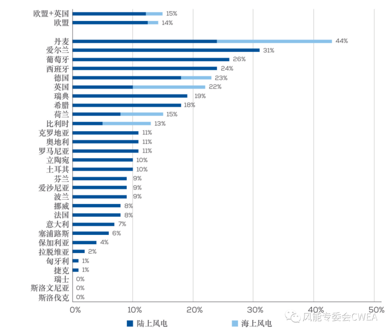 就風(fēng)電在各國(guó)電力消費(fèi)中的占比而言,共有15個(gè)國(guó)家高于10%。丹麥?zhǔn)亲罡叩?,達(dá)到44%;愛爾蘭和葡萄牙分別為31%、26%;西班牙(24%)、德國(guó)(23%)、英國(guó)(22%)居于其后。