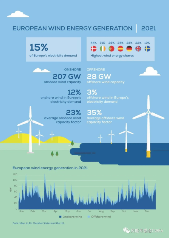 2021年,歐盟與英國(guó)全部風(fēng)電機(jī)組的平均容量因數(shù)(capacityfactor)達(dá)到24%(陸上風(fēng)電為23%,海上風(fēng)電為35%),比2020年下降3%。