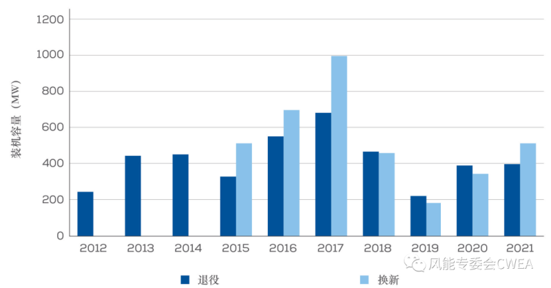 圖5 2012—2021年歐洲退役與換新風(fēng)電裝機(jī)容量