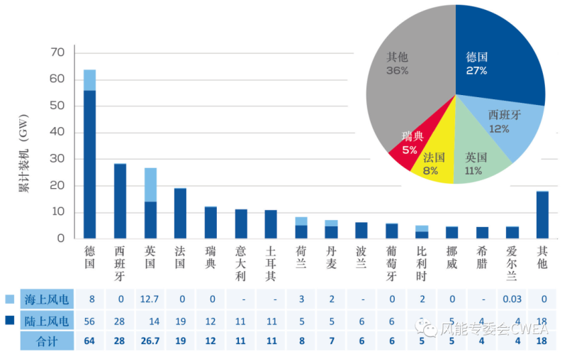 德國(guó)的風(fēng)電累計(jì)裝機(jī)規(guī)模最大,達(dá)到64GW;緊隨其后的是西班牙(28GW)、英國(guó)(26.7GW)、法國(guó)(19GW)、瑞典(12GW)。這五個(gè)國(guó)家合計(jì)占比64%。