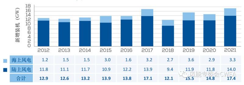 2021年,在審批流程以及全球供應(yīng)鏈等問題持續(xù)拖累新建風(fēng)電場(chǎng)并網(wǎng)的不利形勢(shì)下,歐洲新增風(fēng)電裝機(jī)17.4GW(陸上風(fēng)電為14GW,海上風(fēng)電為3.4GW),同比增長(zhǎng)18%,超過了歷史最好水平?2017年的17.1GW。然而,這依然比歐洲風(fēng)能協(xié)會(huì)在2021年2月給出的預(yù)測(cè)值低了11%,也不足歐洲實(shí)現(xiàn)2030年能源與氣候目標(biāo)所需的年度裝機(jī)規(guī)模。要想到2030年讓可再生能源在歐盟能源結(jié)構(gòu)中的占比達(dá)到40%,期間的風(fēng)電年均新增裝機(jī)容量不能低于32GW。