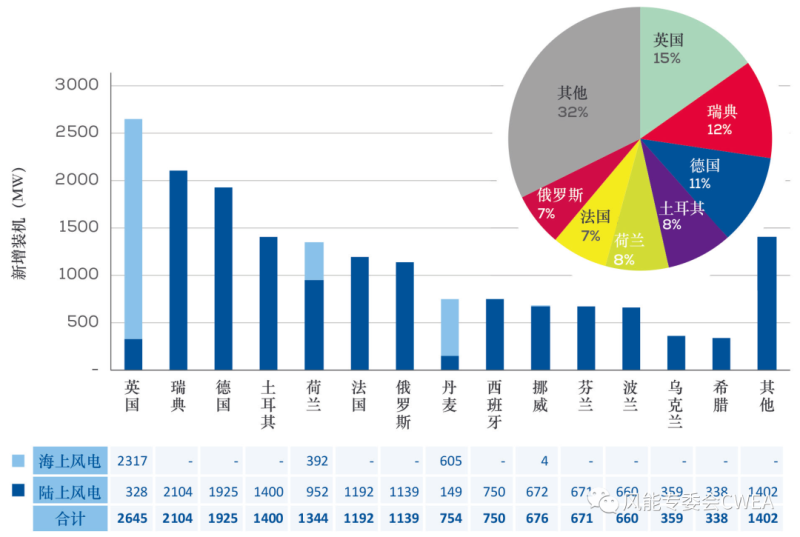 在全部新增裝機(jī)中,歐盟占63%,裝機(jī)規(guī)模為11GW。歐盟之外,新增裝機(jī)集中于英國(guó)、土耳其、俄羅斯。