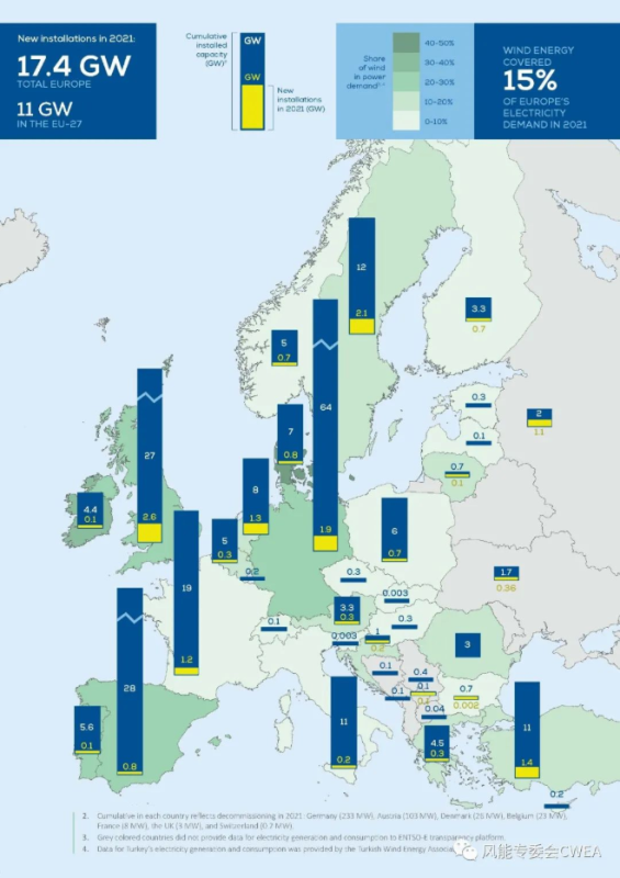 2021年,歐盟和英國(guó)的風(fēng)電場(chǎng)共發(fā)電437TWh,滿足了這些國(guó)家15%的全社會(huì)電力需求,比2020年下降1.4個(gè)百分點(diǎn),與2019年基本相當(dāng)。