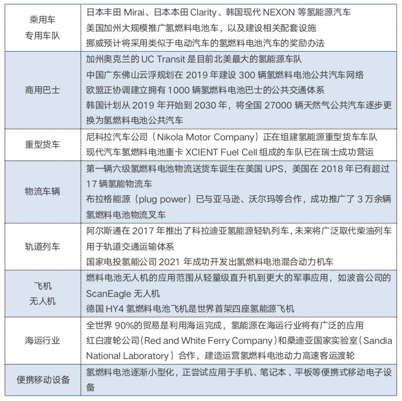 國際氫能應(yīng)用場景的部分案例