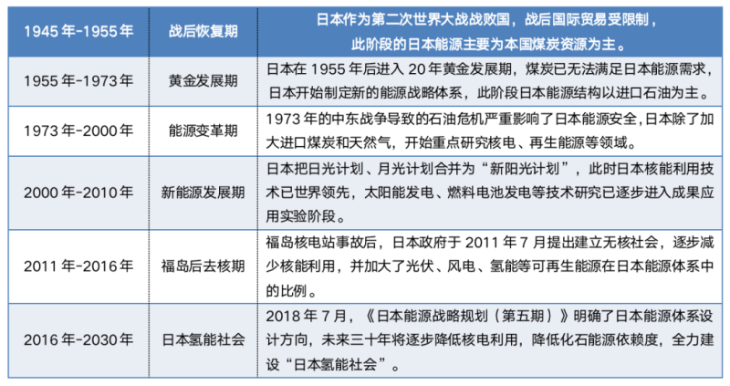 氫能在日本能源戰(zhàn)略規(guī)劃中占有極其重要地位,自第二次世界大戰(zhàn)以來,日本能源體系發(fā)展自大致經(jīng)歷了六個(gè)階段,日本近十年陸續(xù)制定《日本再復(fù)興戰(zhàn)略》《氫能與燃料電池戰(zhàn)略發(fā)展路線圖》《日本能源戰(zhàn)略規(guī)劃》等一系列政策,發(fā)展氫能已提升為日本國策,日本將建設(shè)全球第一個(gè)全面利用氫能的國家。