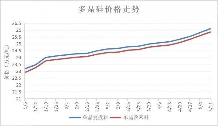 上周因假期暫停報(bào)價(jià),本周硅料價(jià)格漲幅進(jìn)一步擴(kuò)大。5月11日,硅業(yè)分會(huì)公布的價(jià)格顯示,國(guó)內(nèi)單晶復(fù)投料價(jià)格區(qū)間在25.5到26.6萬(wàn)元/噸,成交均價(jià)上漲至26.11萬(wàn)元/噸,周環(huán)比漲幅為2.23%;單晶致密料價(jià)格區(qū)間在25.3到26.4萬(wàn)元/噸,成交均價(jià)上漲至25.87萬(wàn)元/噸,周環(huán)比漲幅為2.13%。