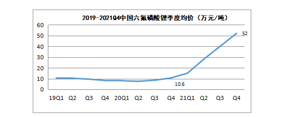 對于市場供需的錯(cuò)判以及主要原材料碳酸鋰、VC溶劑價(jià)格的飆升,導(dǎo)致2020年Q4以來六氟磷酸鋰的“大牛市”。六氟磷酸鋰價(jià)格從2020Q4的10.6萬元/的噸上升至2021Q4的52萬元/噸。