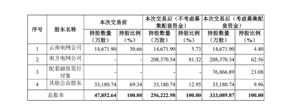 文山電力總股本原為4.78億股,本次交易完成前后公司的股本結(jié)構(gòu)如下表。其中,南方電網(wǎng)公司直接持股比例為 62.56%,由上市公司間接控股股東變更為上市公司直接控股股東。