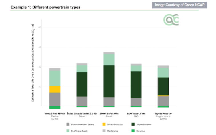 綠色NCAP研究的全部結(jié)果可以在發(fā)表的新聞中找到,然而比較質(zhì)量/尺寸和車(chē)身形狀相似但動(dòng)力系統(tǒng)不同的車(chē)輛尤為有趣。雖然電動(dòng)汽車(chē)在使用期間不會(huì)對(duì)當(dāng)?shù)禺a(chǎn)生任何排放,但生產(chǎn)電動(dòng)汽車(chē),包括所有的電氣和電子元件以及內(nèi)部的高壓電池,預(yù)計(jì)將產(chǎn)生大量溫室氣體(GHG)。再加上在其使用壽命內(nèi)提供電能時(shí)排放的預(yù)估溫室氣體,使生命周期排放量更接近一些內(nèi)燃機(jī)(ICE)車(chē)輛。盡管如此,電動(dòng)汽車(chē)仍然顯示出最好的結(jié)果,特別是當(dāng)添加回收電子元件的好處時(shí)。