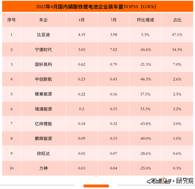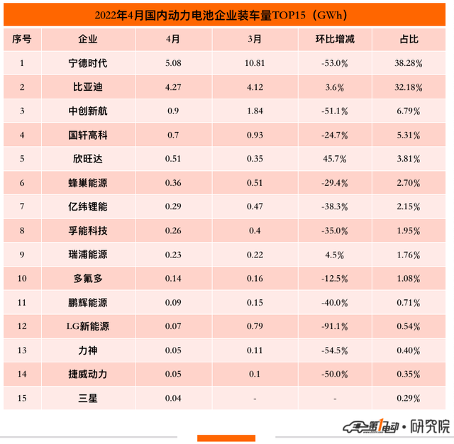 最重要的變化是,寧德時(shí)代市占率嚴(yán)重下滑,從3月(50%)下降十二個(gè)百分點(diǎn)至4月38%,而比亞迪逆勢大漲,市占率從3月(19.24%)提升近十三個(gè)百分點(diǎn)至32.18%。