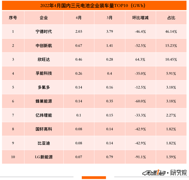 三元電池材料方面,4月寧德時(shí)代裝車量2GWh,環(huán)比下降46.5%,占比46%,位居冠軍,中創(chuàng)新航裝車量0.67GWh,環(huán)比下降52.5%,占比下降2個(gè)百分點(diǎn)至15.23%,位居第二,欣旺達(dá)裝機(jī)量0.46GWh,環(huán)比大漲64.3%,占比提升近7個(gè)百分點(diǎn)至10.45%,排名提升3個(gè)名次至第三。