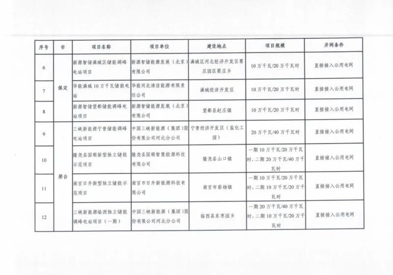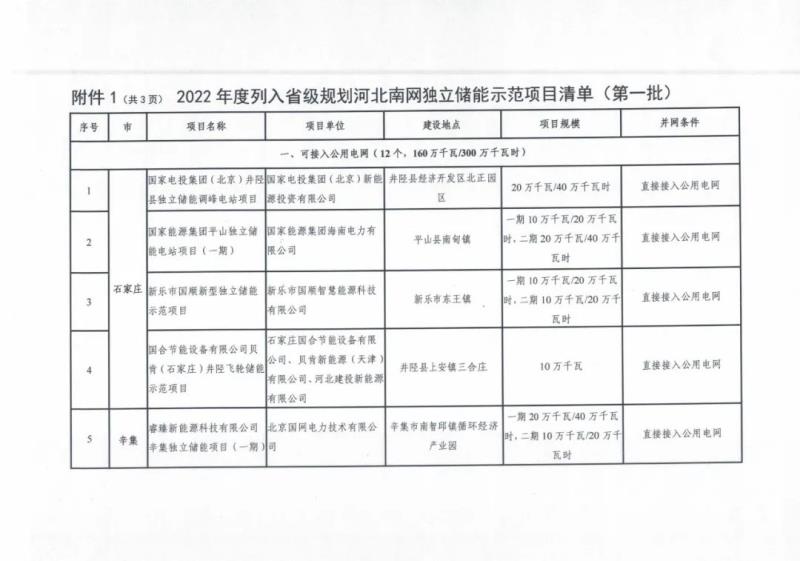 2022年度列入省級規(guī)劃河北南網(wǎng)儲能示范項目清單(第一批):
