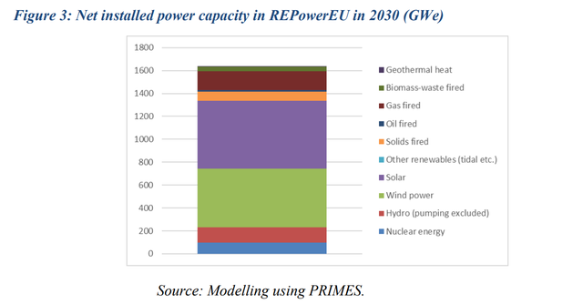 值得一提的是,雖然歐盟沒怎么在通告中提風(fēng)能,但在官方文件預(yù)測的新增可再生能源裝機(jī)量時(shí),風(fēng)能與光伏的比重大致相當(dāng),占據(jù)整個(gè)可再生能源的絕大部分比重。