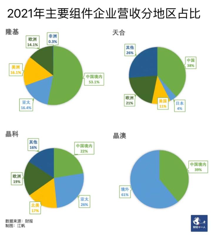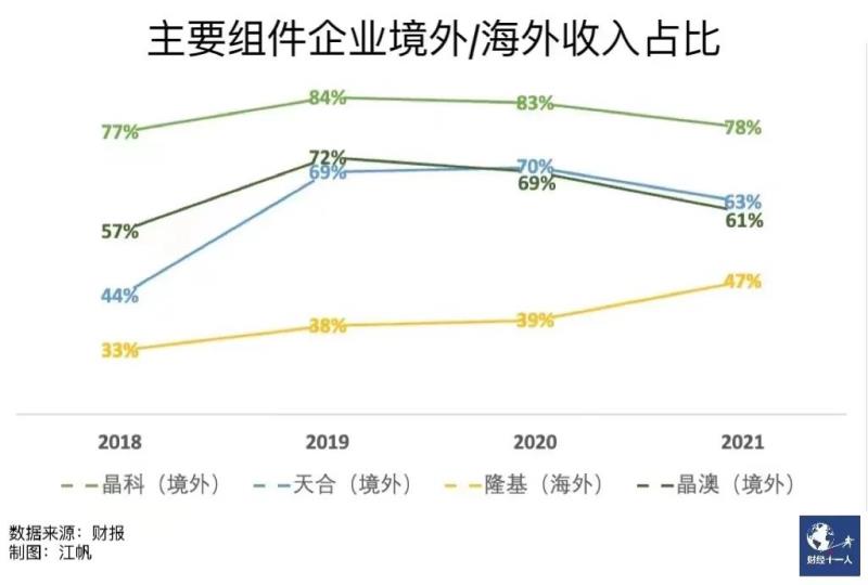 面對多地開花的海外市場,組件巨頭的全球化布局至關(guān)重要。得益于較早開展業(yè)務(wù),三巨頭建立起了較為完善的全球化銷售網(wǎng)絡(luò),為開拓渠道奠定基礎(chǔ)、加深壁壘,有效減輕對個別市場過度依賴。2021年,三巨頭海外收入占比均在60%以上,明顯高于以國內(nèi)市場為重心的隆基。