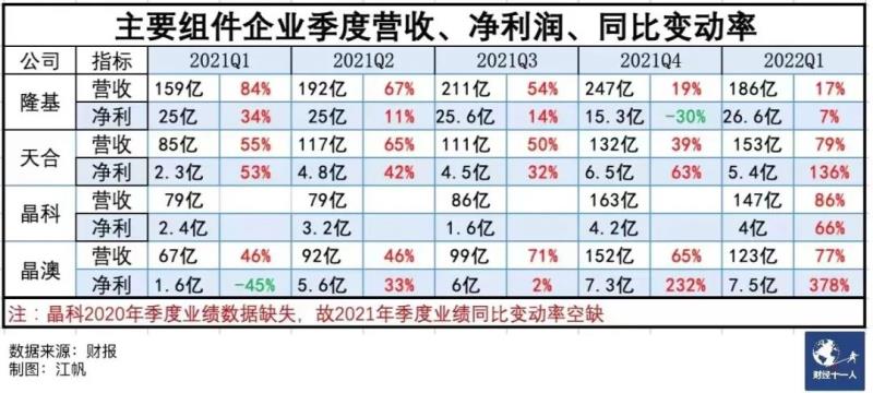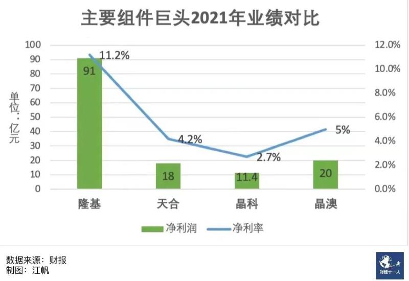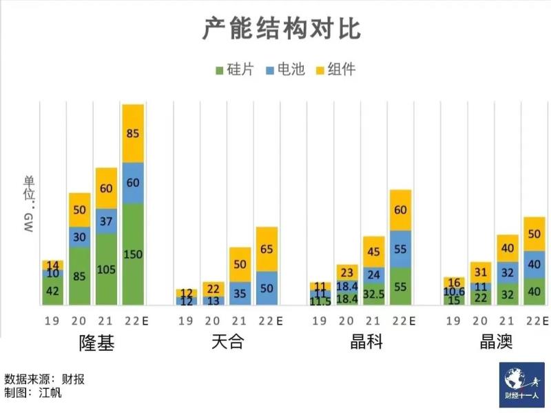 天合2020年中回A,是唯一一個沒有硅片產(chǎn)能的組件巨頭,只有電池、組件兩端產(chǎn)能。這也是天合盈利能力不如晶澳的主要原因。一位接近天合的知情人士對《財經(jīng)十一人》表示,天合是輕資產(chǎn)模式的專業(yè)化企業(yè),過去幾年未大規(guī)模投資硅片,整體利潤表現(xiàn)確實低于一體化企業(yè),但高于同模式企業(yè)。2022年,硅料供需整體依舊偏緊,天合還將承壓一年。