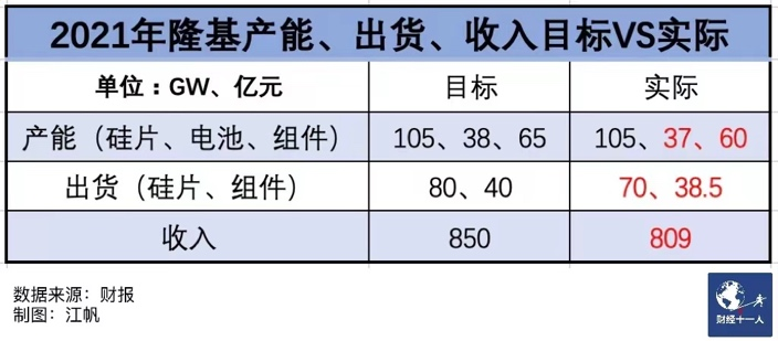 2021年,隆基硅片、組件產(chǎn)能利用率創(chuàng)歷史新低,分別為72%、69%,同比下降23個、21個百分點。受此影響,其四季度凈利潤罕見下滑30%,且全年產(chǎn)能、業(yè)務(wù)、收入目標(biāo)均未完成。