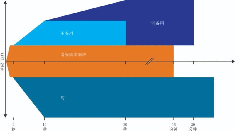 當電網(wǎng)中VRE的比重較低時,運營備用需求傳統(tǒng)上是按照最大負荷的一定比例或者根據(jù)系統(tǒng)最大事故備用確定的,換句話說,也就是此時最大的發(fā)電單元。在低VRE比例下,備用分為了FCR(頻率抑制備用)或者主備用、FRR(頻率恢復備用)或輔備用、RR(替代備用)或第三備用。FCR用于阻止頻率偏差,需要在事故第一時間動作。FRR將頻率恢復到正常值,需要在30秒內動作。RR用于替代FRR,在15分鐘內動作。