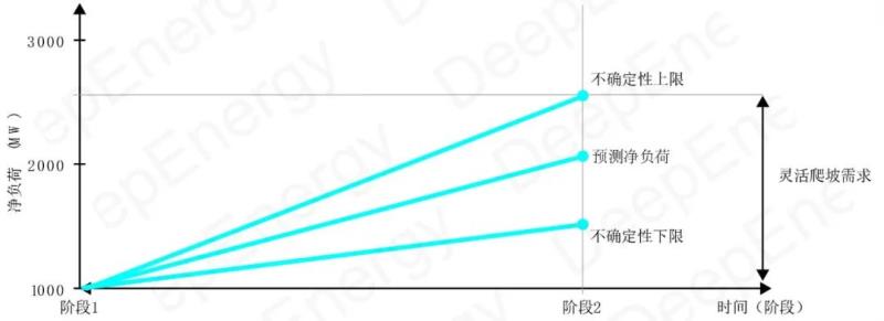 FRP是一種輔助服務(wù)并且常有兩個獨立的產(chǎn)品,一個是爬坡調(diào)節(jié),叫做靈活爬坡(FRU),另一種是降坡調(diào)節(jié),叫做靈活降坡(FRD)。這種產(chǎn)品可以綜合需求和VRE的調(diào)節(jié)要求,將凈負(fù)荷偏差考慮進(jìn)來,然后反映出調(diào)節(jié)預(yù)測的不確定性。在預(yù)測上,像電網(wǎng)系統(tǒng)其他備用要求一樣,F(xiàn)RP試圖將需求和VRE的預(yù)測偏差考慮進(jìn)來。圖3給出了一個示例,在給定凈負(fù)荷曲線和預(yù)測不確定度時,F(xiàn)RP的調(diào)節(jié)要求是怎樣的。