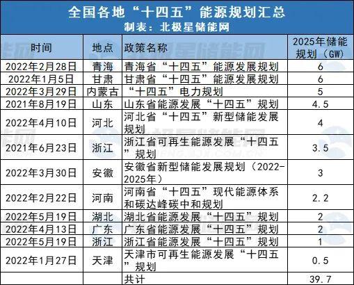 據北極星統(tǒng)計,截止到目前共有湖北、浙江、廣東、安徽、河北、內蒙古等12個省市明確提出儲能規(guī)劃,到2025年新型儲能裝機共計39.7GW。其中青海、甘肅儲能規(guī)模最大,2025年新型儲能預計裝機6GW。