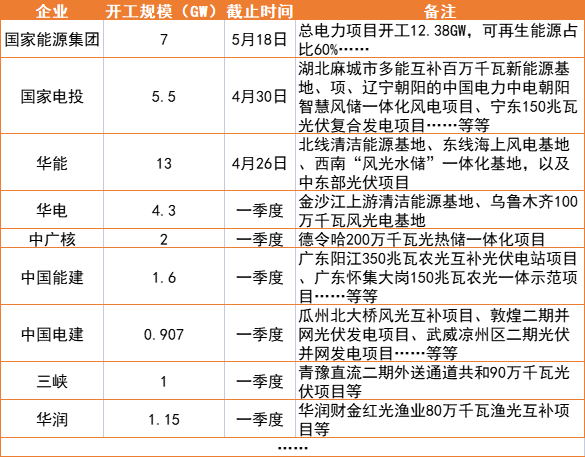事實上,今年已開工新能源項目遠遠不僅于此,根據(jù)國家能源局相關信息顯示,風光大基地項目已開工超84GW。地方國企例如京能、深能、贛能、晉能等均有新能源項目開工,包括正泰、陽光新能源、晶科電力以及全國各省市的整縣光伏項目等均已陸續(xù)開工。