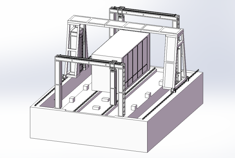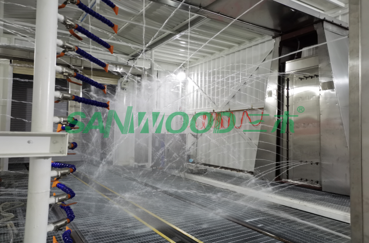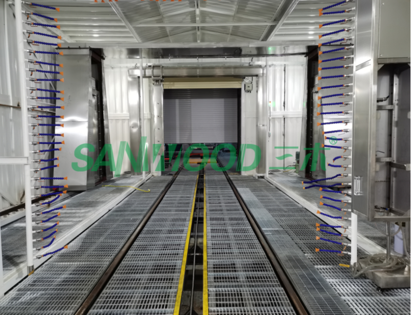集裝箱頂部與左右兩側采用行車固定自動噴淋系統(tǒng),前后側采用龍門支架,噴頭可左右移動。