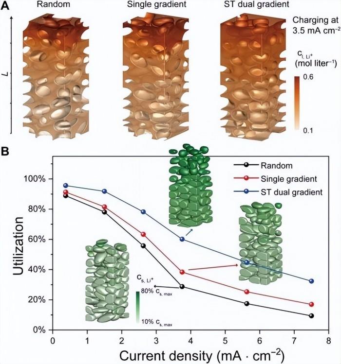 “我們將這種結(jié)構(gòu)稱之為雙梯度電極?!北R磊磊說,模擬計(jì)算結(jié)果表明,在大電流密度充電條件下,這種新結(jié)構(gòu)相對(duì)于傳統(tǒng)的隨機(jī)均質(zhì)電極以及單梯度電極,展現(xiàn)出了優(yōu)異的快充性能。