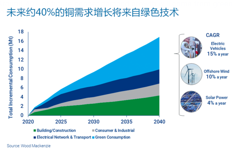 銅的使用基于其延展性、傳熱性和抗菌特性。加之良好的導(dǎo)電性能,我們預(yù)計,未來40%的需求增長將來自綠色技術(shù)中的電力應(yīng)用,包括電動汽車、海上風(fēng)電和光伏設(shè)備。