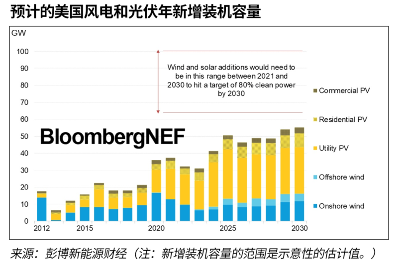 中國儲能網(wǎng)訊:美國總統(tǒng)喬·拜登提出到2030年實(shí)現(xiàn)清潔電力占比80%的目標(biāo),而彭博新能源財(cái)經(jīng)的一份報(bào)告發(fā)現(xiàn),2022年至2030年期間美國新增的風(fēng)電和光伏裝機(jī)容量不足以滿足這一愿景。短期瓶頸是供應(yīng)鏈和關(guān)稅不確定性。長期而言,老舊的電網(wǎng)基礎(chǔ)設(shè)施和繁文縟節(jié)將阻礙可再生能源裝機(jī)容量的進(jìn)一步擴(kuò)大。