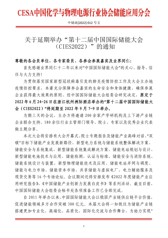 關(guān)于延期舉辦“第十二屆中國國際儲(chǔ)能大會(huì)(CIES2022)”的通知