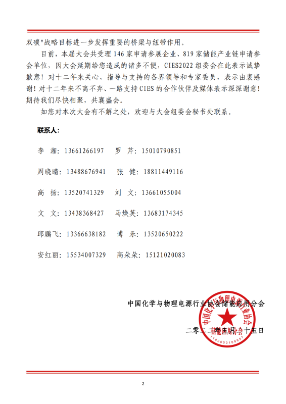 目前,本屆大會(huì)共受理146家申請(qǐng)參展企業(yè)、819家儲(chǔ)能產(chǎn)業(yè)鏈申請(qǐng)參會(huì)單位,因大會(huì)延期給您造成的諸多不便,CIES2022組委會(huì)在此表示誠摯歉意!對(duì)十二年來關(guān)心、指導(dǎo)與支持的各界領(lǐng)導(dǎo)和專家委員,表示由衷感謝!對(duì)十二年來不離不棄、一路支持CIES的合作伙伴及媒體表示深深謝意!期待我們盡快相聚,共襄盛會(huì)。