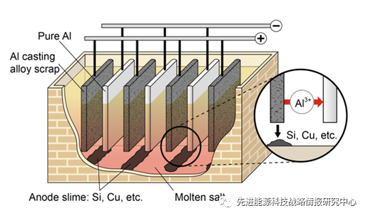中國儲能網(wǎng)訊:利用重熔技術(shù)回收電池中鋁廢料會降低鋁的品位,而這種降級的再生鋁的最終沉降物是鑄鋁合金。隨著電動汽車廣泛應(yīng)用,對高等級鋁的需求預(yù)計將增加,而低等級再生鋁的需求將下降。為了滿足未來對高品位鋁的需求,需要一種新的鋁回收方法。
