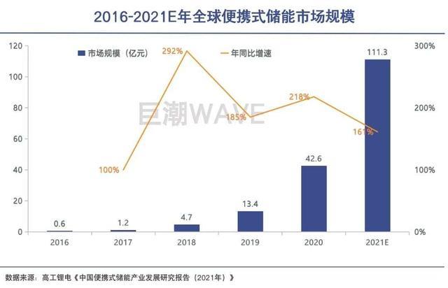 機(jī)構(gòu)高工鋰電報(bào)告顯示,自2017年至今,全球便攜式儲(chǔ)能的市場(chǎng)規(guī)模每年至少翻一倍。預(yù)計(jì)2021年全球市場(chǎng)規(guī)模達(dá)到111.3億元,同比增速超過160%,呈現(xiàn)出持續(xù)爆發(fā)式增長(zhǎng)的態(tài)勢(shì)。
