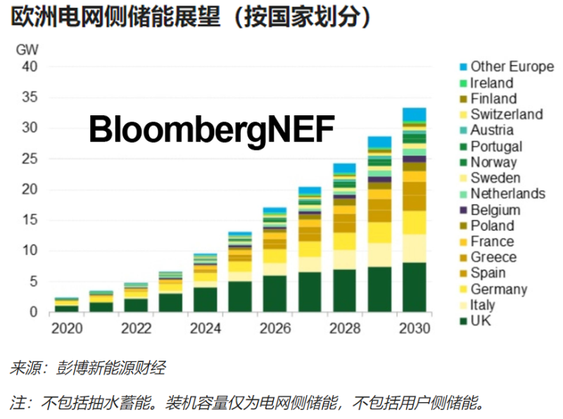 到2030年底,歐洲累計電網(wǎng)側(cè)儲能裝機