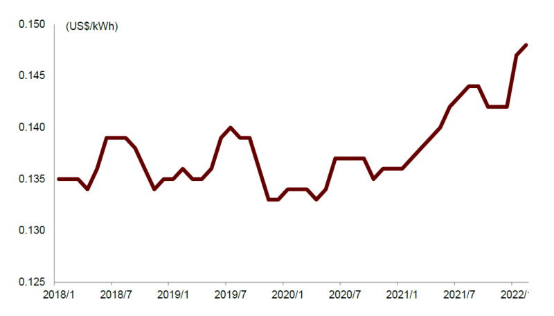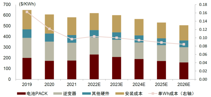 家庭儲能安裝成本下降提升其經(jīng)濟(jì)性。從成本拆解來看,2021年家庭儲能度電成本近600美元/KWh,其中電池PACK及逆變器成本各占約1/3,2022年受上游碳酸鋰等原材料漲價影響,鋰電池價格上漲,我們預(yù)期其將在2023年后逐步回落,預(yù)計至2026年家儲安裝成本將下降至約500美元/KWh,相比2021年下降22%,其經(jīng)濟(jì)性有望進(jìn)一步提升。