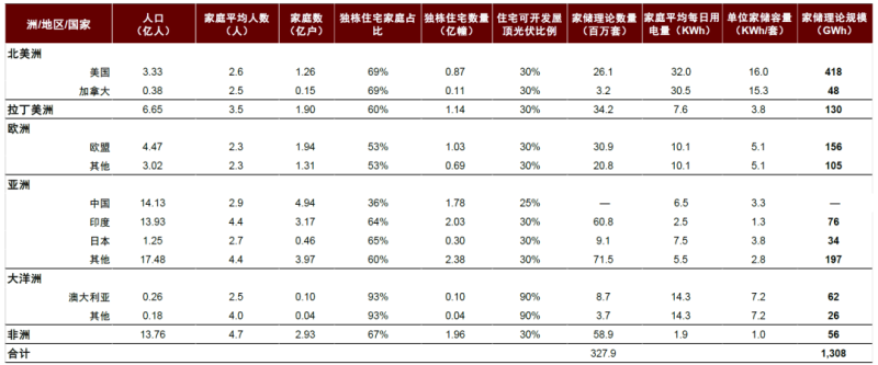 注:家儲在中國居民側(cè)電價機(jī)制下經(jīng)濟(jì)差、中國整縣推進(jìn)模式更適宜集中式儲能,故未測算中國理論市場規(guī)模。獨棟住宅戶占比,拉丁美洲及亞洲其他地區(qū)按照60%、其他地區(qū)按照當(dāng)?shù)貙嶋H水平分別進(jìn)行測算;住宅可開發(fā)屋頂光伏比例,澳大利亞按照其實際水平、其他地區(qū)按照30%分別進(jìn)行測算;單位家儲容量,按照各地區(qū)戶均每日用電量的50%進(jìn)行測算。資料來源:NREL,Eurostat,ISF,STATS SA,Worldometer,Statista,中金公司研究部