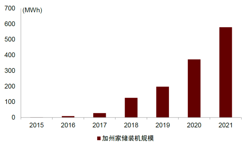 加州擁有全美最大的光伏市場,2020年起,加州所有新建的住宅將被要求安裝光伏系統(tǒng),2021年加州戶用光伏裝機(jī)量約1.4GW,同比增長約32%,戶用儲能裝機(jī)規(guī)模約580MWh,同比增長55%。