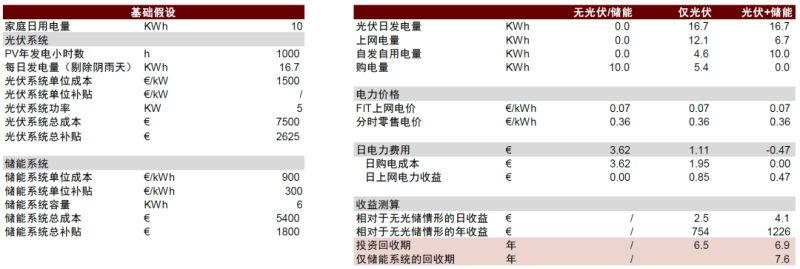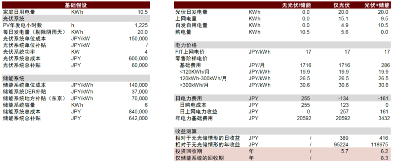我們測算以日本東京家庭為例測算戶用光伏及儲能的經(jīng)濟(jì)性。我們假設(shè)無光伏/儲能系統(tǒng)地家庭和安裝光伏或光儲系統(tǒng)的家庭均采用階梯電價。測算發(fā)現(xiàn):僅安裝光伏系統(tǒng)投資的回收期約5.7年,光伏+儲能系統(tǒng)投資回收期約6.2年,光儲系統(tǒng)中添加額外的儲能的投資回收期約8.3年,光伏系統(tǒng)已存在一定經(jīng)濟(jì)性,而儲能系統(tǒng)在日本DER補貼及地方政府高額補貼下同樣具備一定經(jīng)濟(jì)性。