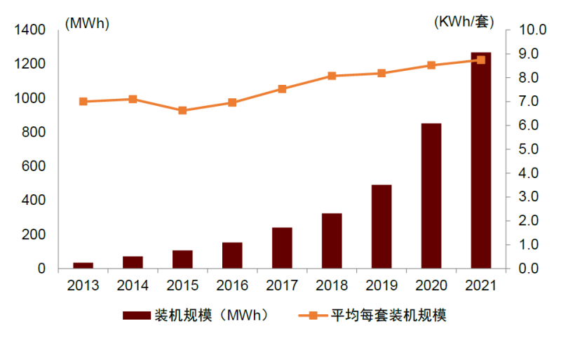 德國家儲裝機(jī)快速發(fā)展,占儲能裝機(jī)主導(dǎo)地位。根據(jù)德國亞琛工業(yè)大學(xué)相關(guān)研究數(shù)據(jù),2021年德國戶用儲能新增套數(shù)約14.5萬套,對應(yīng)家儲裝機(jī)量約1268 MWh,同比增長49%,占德國總儲能裝機(jī)量份額超90%。從家儲單套規(guī)模來看,2021年平均規(guī)模約8.7KWh,近五年持續(xù)提升。