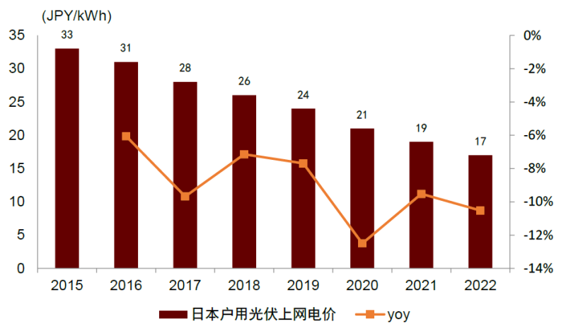 圖表16:日本戶用光伏上網(wǎng)電價持續(xù)退坡