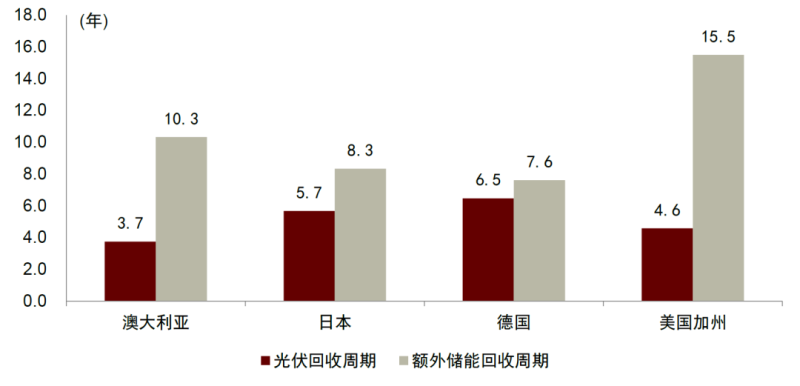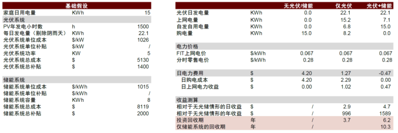 我們測算美國加州戶用光伏及儲能的經(jīng)濟(jì)性。我們假設(shè)無光伏/儲能系統(tǒng)地家庭采用單一固定電價,而安裝光伏或光儲系統(tǒng)的家庭采用分時電價,測算發(fā)現(xiàn):僅安裝光伏系統(tǒng)投資的回收期約4.6年,光伏+儲能系統(tǒng)投資回收期約5.9年,光儲系統(tǒng)中添加額外的儲能的投資回收期約15.5年, 光伏系統(tǒng)已存在一定經(jīng)濟(jì)性,但戶用儲能系統(tǒng)經(jīng)濟(jì)性尚未具備經(jīng)濟(jì)性。