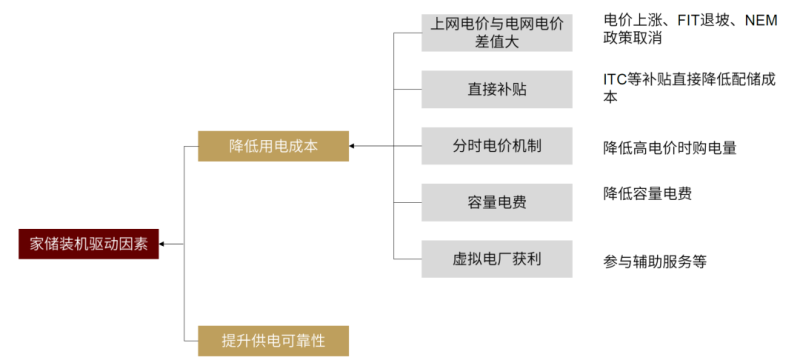 我們認(rèn)為家儲核心驅(qū)動力包括降低家庭用電成本與提升供電可靠性:政策、電力市場機(jī)制等多種方式共同驅(qū)動配儲成本下降、降低家庭用電成本;突發(fā)停電事件時家庭儲能可作為備用電源提升家庭供電可靠性。