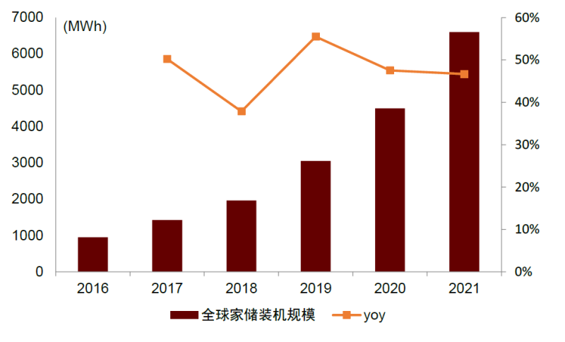 2022-2026年期間,假設(shè)全球各國平均能源價格不發(fā)生劇烈波動,那么在無補貼區(qū)域,家儲的經(jīng)濟(jì)性仍不顯著(相比僅安裝光伏),我們預(yù)計家儲的主要市場仍然是歐、美、澳、日等國,發(fā)展中國家則使用更為廉價的便攜式儲能和光伏來提供電能。我們通過戶用光伏裝機(jī)預(yù)測數(shù)據(jù),并假設(shè)光伏配儲比例,同時考慮部分現(xiàn)有戶用光伏新增儲能需求,推算預(yù)測全球儲能裝機(jī)量:我們預(yù)計2022年全球儲能裝機(jī)量有望達(dá)9.4GWh,同比增長43%,至2025年全球戶用儲能裝機(jī)有望達(dá)近20GWh。