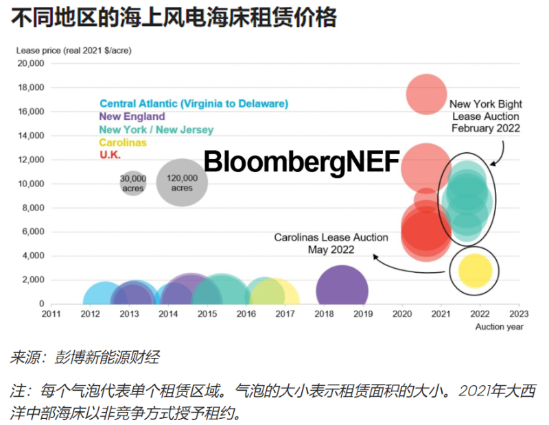 今年2月,紐約灣的租賃競價(jià)以10,696美元/英畝的最高價(jià)打破了美國海上能源租賃價(jià)格的記錄。相比之下,南北卡羅來納州拍出的最高租賃價(jià)僅為2,912美元/英畝。紐約灣位于新澤西州和紐約州之間,這兩個州制定了全美最高的2035年海上風(fēng)電目標(biāo),并設(shè)立了明確的采購框架,積極推進(jìn)海上風(fēng)電項(xiàng)目簽署協(xié)議,因此推動了競爭和價(jià)格的上漲。
