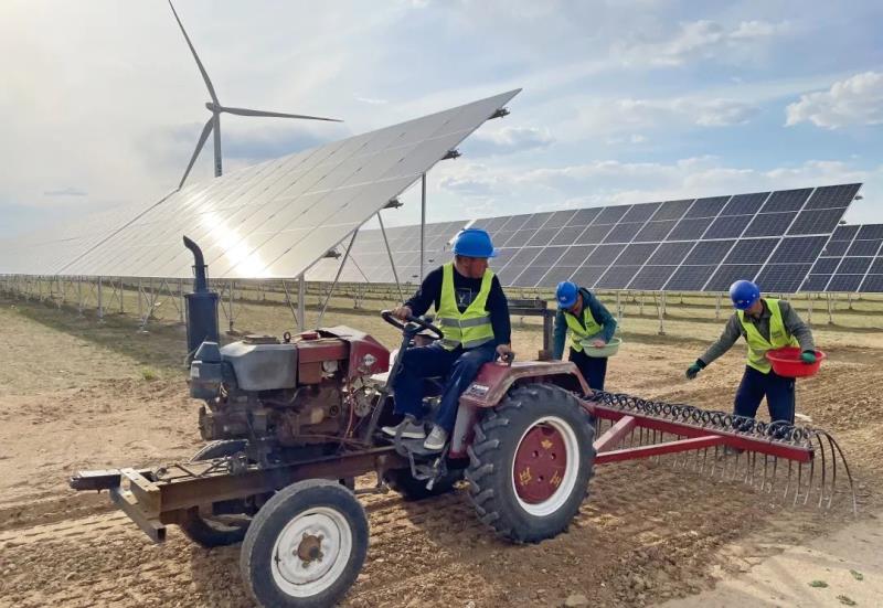 “除了光伏區(qū),風(fēng)力發(fā)電機(jī)基座周圍和風(fēng)場(chǎng)臨時(shí)施工道路,也要陸續(xù)復(fù)種?!笔┕ろ?xiàng)目部現(xiàn)場(chǎng)經(jīng)理王欣說(shuō)。今年4月,剛種下的主要是草苜蓿、批堿草、羊草、雜草等這些耐寒耐旱的草種,光伏板下已經(jīng)長(zhǎng)出了好長(zhǎng)一截,偶爾還能發(fā)現(xiàn)野生的沙蔥。
