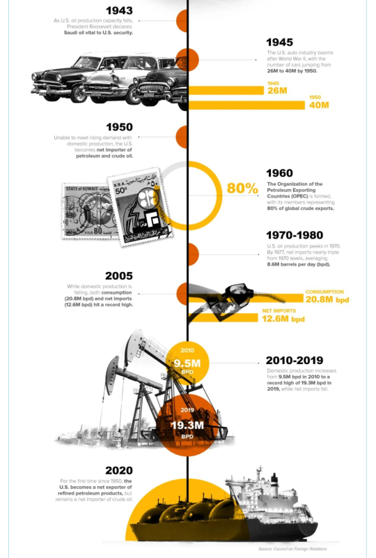 1950年:美國有4000萬輛汽車在路上行駛,成為石油凈進(jìn)口國,每天需要進(jìn)口50萬桶石油。