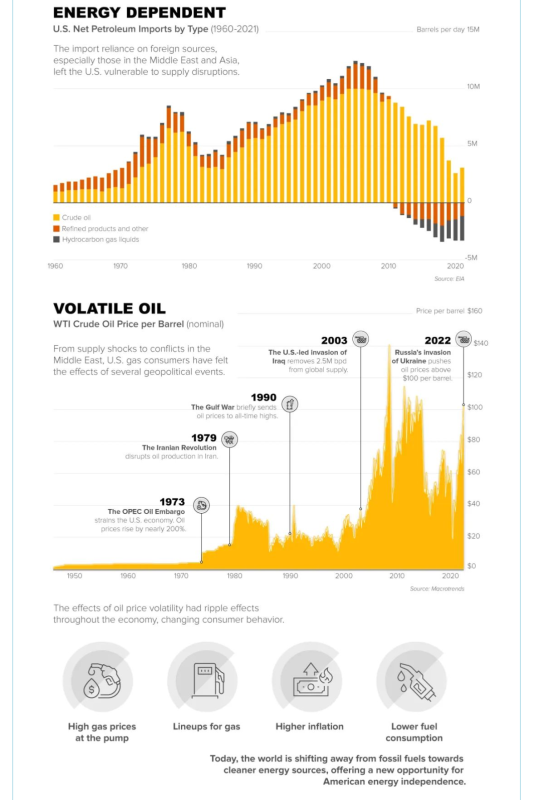 中國儲(chǔ)能網(wǎng)訊:追求能源獨(dú)立長期以來一直是美國政治和外交政策的一部分,自20世紀(jì)70年代以來更是如此,但美國仍然經(jīng)常依賴石油進(jìn)口來滿足其不斷增長的需求。這種“能源對(duì)外依賴”使美國和美國消費(fèi)者很容易受到供應(yīng)中斷和油價(jià)沖擊的影響。Virtutal Capitalist網(wǎng)站發(fā)表信息圖,顯示美國如何能源進(jìn)口依賴的歷史。