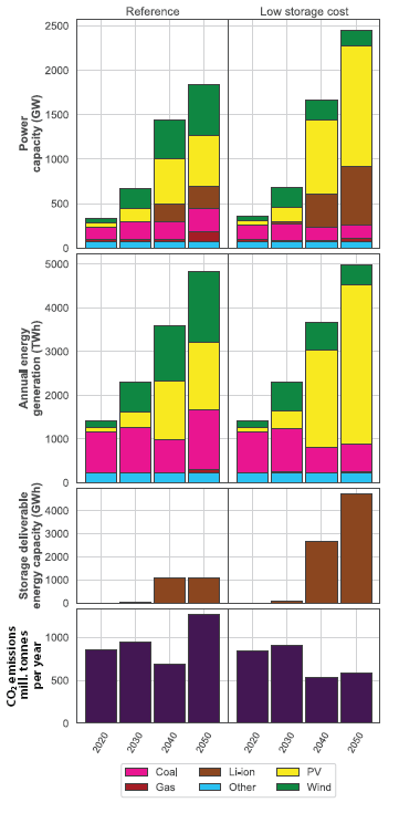 研究表明,依賴燃煤發(fā)電的新興市場和發(fā)展中經(jīng)濟(jì)體無法獲得豐富的低成本天然氣基礎(chǔ)設(shè)施,例如印度代表了儲(chǔ)能技術(shù)電力系統(tǒng)應(yīng)用的一個(gè)非常龐大且重要的未來市場。該項(xiàng)研究的建模表明,儲(chǔ)能系統(tǒng)將主要部署在輸電層面,在城市配電網(wǎng)絡(luò)中還有重要的附加應(yīng)用。整體經(jīng)濟(jì)增長(尤其是空調(diào)在印度的迅速普及)將成為儲(chǔ)能部署的主要驅(qū)動(dòng)力。假設(shè)技術(shù)成本持續(xù)下降,發(fā)現(xiàn)從成本的角度來看,印度的可再生能源發(fā)電設(shè)施在中長期內(nèi)與燃煤發(fā)電廠競爭具有優(yōu)勢,但現(xiàn)有燃煤發(fā)電廠仍然缺乏碳定價(jià),如圖5左側(cè)所示。圖5右側(cè)顯示了假設(shè)印度可以使用低成本儲(chǔ)能系統(tǒng)和可再生能源發(fā)電技術(shù)的場景的建模結(jié)果。這些結(jié)果表明,與基線預(yù)測相比,印度電力系統(tǒng)的系統(tǒng)成本和模擬二氧化碳排放量均顯著降低(見左圖)。無論碳排放是否有上限或稅收,電力系統(tǒng)成本和二氧化碳排放都會(huì)降低。這一結(jié)果突出了降低儲(chǔ)能成本的全球環(huán)境效益。