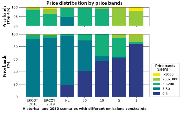 這是因?yàn)椋c目前主要依賴火力發(fā)電設(shè)施的電力系統(tǒng)相比,以可再生能源為主的部署儲(chǔ)能系統(tǒng)的電力系統(tǒng)將具有相對較高的固定投資成本和相對較低的邊際運(yùn)營成本。圖4比較了德克薩斯州電力可靠性委員會(huì)(ERCOT)的電力系統(tǒng)中2018年和2019年的每小時(shí)批發(fā)電價(jià)格分布,該電力系統(tǒng)幾乎覆蓋了德克薩斯州的所有地區(qū),以及2050年的情景。圖中的條形代表無限制和受碳限制的德克薩斯建模案例的價(jià)格分布。增加對可再生能源發(fā)電設(shè)施的依賴,邊際成本為零。隨著碳限制變得更加嚴(yán)格(即允許的排放量逐漸降低),這種影響會(huì)增加。在價(jià)格最高的時(shí)段,如柱形頂部和圖中的分解部分所示,模擬價(jià)格明顯高于當(dāng)前德克薩斯州電力可靠性委員會(huì)(ERCOT)市場的價(jià)格。