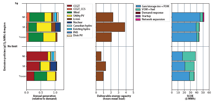 研究團(tuán)隊(duì)對美國電力部門的建模集中在三個(gè)地區(qū):東北部地區(qū)(紐約州和新英格蘭地區(qū))、東南部地區(qū)以及德克薩斯州在2050年最新部署的儲(chǔ)能系統(tǒng)。這些地區(qū)在電力需求概況、風(fēng)力發(fā)電和太陽能發(fā)電資源以及水電和現(xiàn)有核電資源的可用性方面存在顯著差異。這些差異會(huì)影響在沒有碳排放限制的情況下成本最低的發(fā)電組合以及實(shí)現(xiàn)不同程度脫碳的成本。圖3顯示了2050年每個(gè)地區(qū)在兩種政策情景下的年發(fā)電量、可交付能源容量和電力系統(tǒng)電力成本的模擬預(yù)測:無碳限制和排放限制在5克碳排放量/kWh。如果2050年的電力需求與2018年的水平相同,那么將美國電力部門的平均碳強(qiáng)度降低到5克碳排放量/kWh,將使2050年的碳排放量與2005年相比降低99.2%。另一方面,如果2050年用電量增長的需求大于2018年,正如該項(xiàng)研究用于模擬儲(chǔ)能系統(tǒng)影響的電力需求情景中所預(yù)測的那樣。美國各行業(yè)的平均碳排放量與2005年相比,電力部門排放量減少了98.7%。圖3說明結(jié)果來自僅假設(shè)鋰離子電池和抽水蓄能的情景可用,研究團(tuán)隊(duì)對美國地區(qū)的建模評估了廣泛的其他儲(chǔ)能技術(shù)。