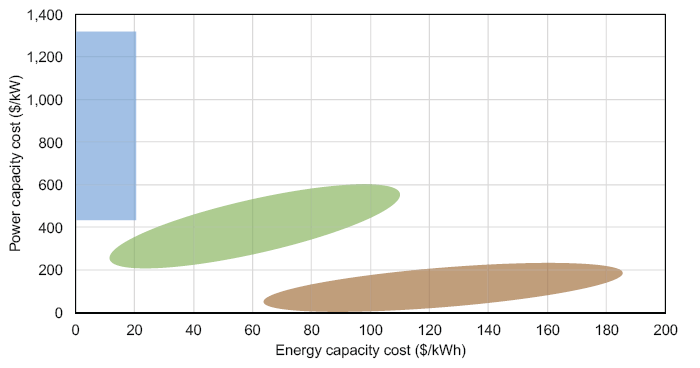 該報(bào)告中考慮的技術(shù)根據(jù)其電力和能源容量成本分為三大類(見圖1)。一般來說,儲(chǔ)能容量成本較低和裝機(jī)容量成本高(圖中藍(lán)色區(qū)域)的儲(chǔ)能技術(shù)最適合作為長時(shí)儲(chǔ)能(持續(xù)時(shí)間最多可達(dá)數(shù)天),這些儲(chǔ)能技術(shù)的充放電不太頻繁,例如熱儲(chǔ)能、化學(xué)儲(chǔ)能、金屬空氣電池和抽水蓄能設(shè)施等。而棕色區(qū)域的儲(chǔ)能技術(shù)(其中包括鋰離子電池儲(chǔ)能系統(tǒng)),更適合持續(xù)時(shí)間較短的儲(chǔ)能應(yīng)用(持續(xù)時(shí)間為幾個(gè)小時(shí))和更頻繁的充放電。具有中等能力的儲(chǔ)能技術(shù)(包括液流電池)處于綠色區(qū)域。